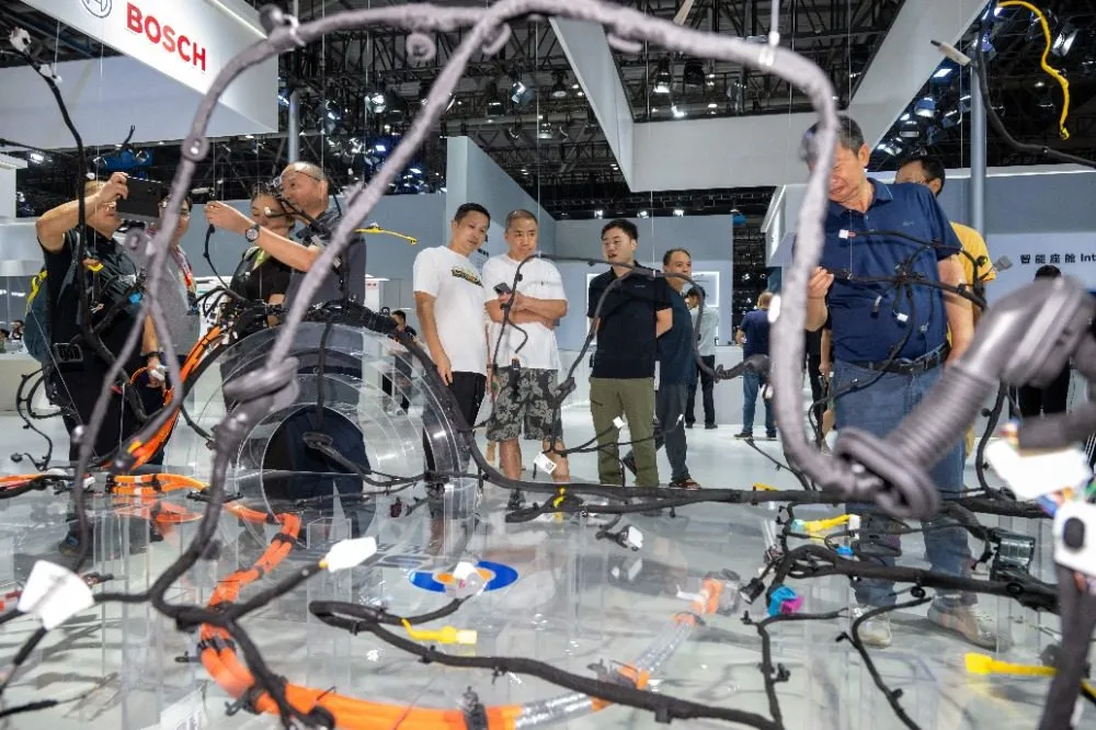 9月5日,重庆国际博览中心,观众在智博会上观看新能源汽车的“血脉”——全车线束结构。记者 崔力 摄