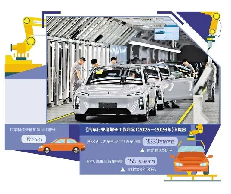 工业和信息化部等8部门近日联合印发《汽车行业稳增长工作方案(2025-2026年)》(以下简称《工作方案》)。《工作方案》提出,2025年,力争实现全年汽车销量3230万辆左右,同比增长约3%,其中新能源汽车销量1550万辆左右,同比增长约20%;汽车出口保持稳定增长;汽车制造业增加值同比增长6%左右。2026年,行业运行保持稳中向好发展态势,产业规模和质量效益进一步提升。