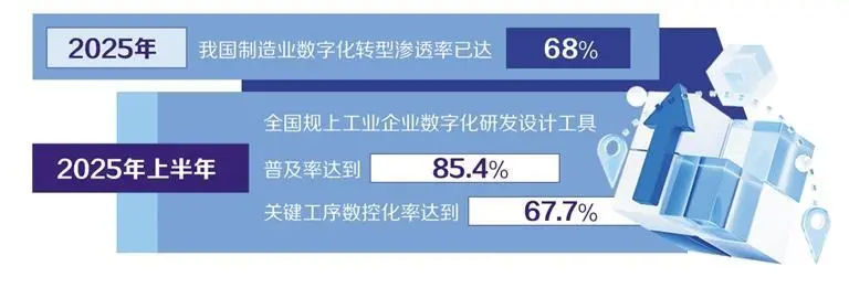 赵刚介绍,我国制造业数字化加快普及。2025年,我国制造业数字化转型渗透率已达68%。2025年上半年,全国规上工业企业数字化研发设计工具普及率达到85.4%、关键工序数控化率达到67.7%。