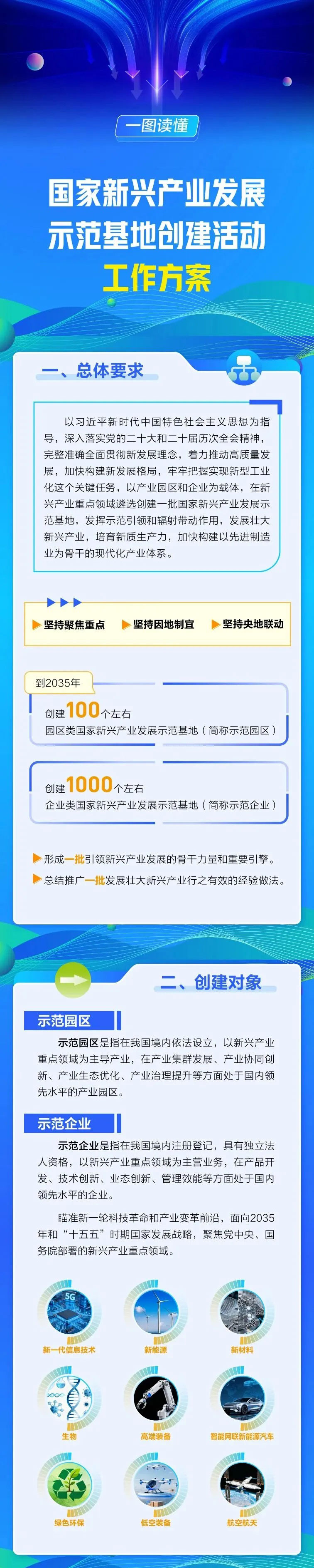 示范基地包括园区和企业两类。园区类示范基地将着力推动产业集群发展、协同创新、生态优化、治理提升,企业类示范基地将在产品开发、技术创新、业态创新、管理效能等方面加强探索。到2035年,创建100个左右园区类示范基地、1000个左右企业类示范基地,形成一批引领新兴产业发展的骨干力量和重要引擎,总结推广一批发展壮大新兴产业行之有效的经验做法,为塑造经济发展新动能新优势、推进新型工业化提供有力支撑。
