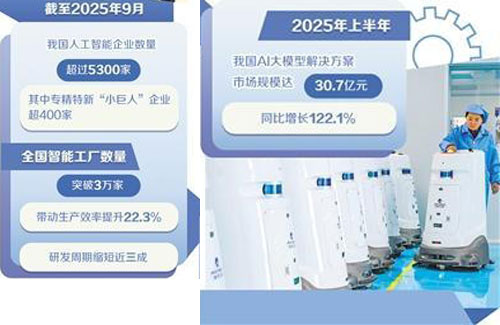 2025年,人工智能加速进入千行百业,应用落地不断深化。“人工智能正深度嵌入制造体系,全国智能工厂数量突破3万家,带动生产效率提升22.3%,研发周期缩短近三成。”刘丽超介绍,2025年上半年,我国AI大模型解决方案市场规模达30.7亿元,同比增长122.1%,企业积极在重点行业拓展人工智能应用场景。