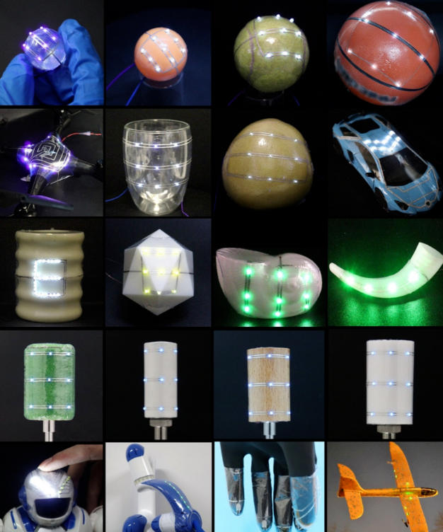 通过该技术,平面电路在约70摄氏度的温水或热风处理后,无论是圆润的苹果、飞机的机翼,还是灵活的手指,都能按照预先设计的“变形蓝图”快速自适应贴合。