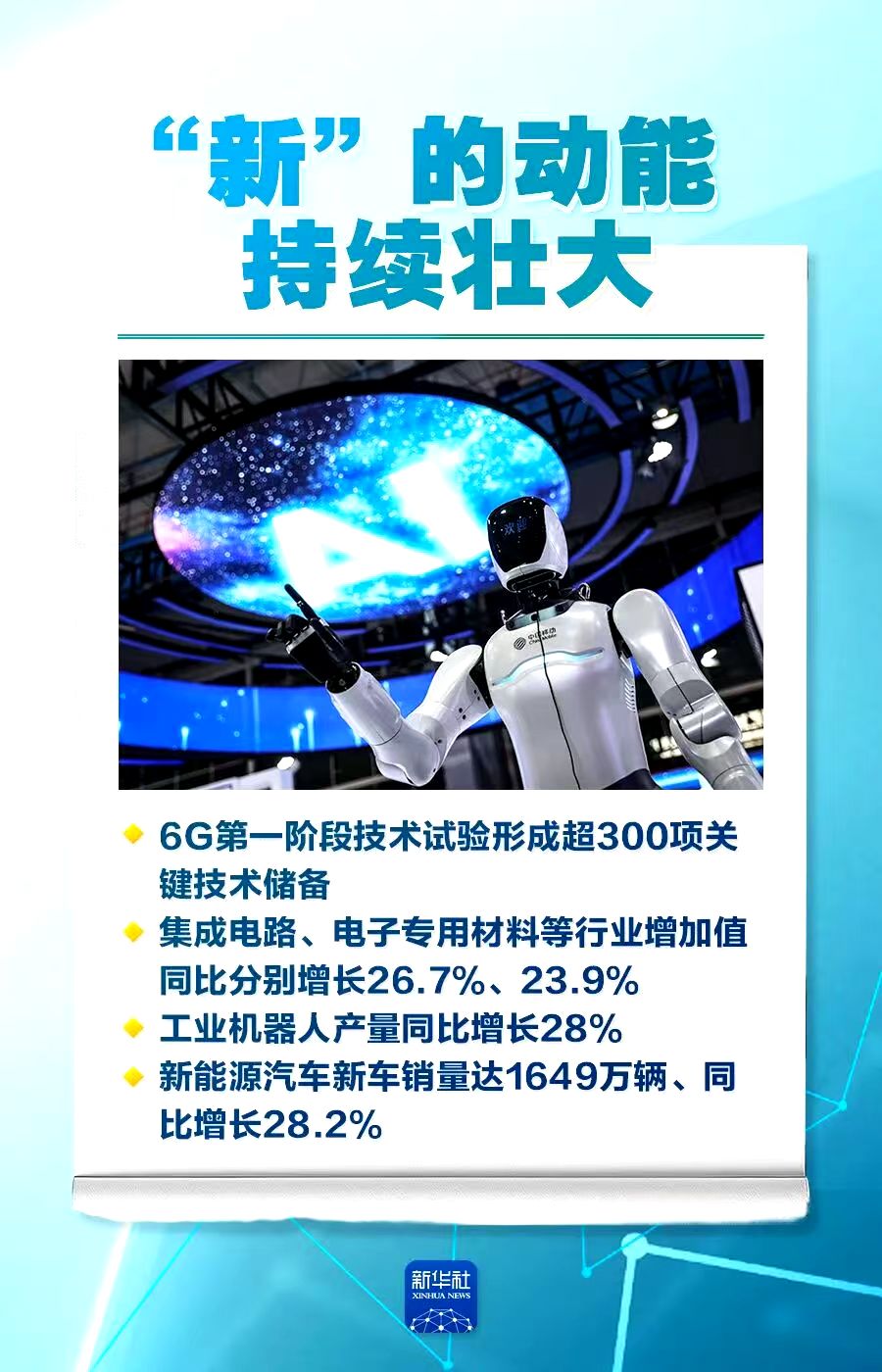 2025年,我国集成电路、电子专用材料等行业增加值同比分别增长26.7%、23.9%;新能源汽车产销量再创新高;6G第一阶段技术试验形成超300项关键技术储备;国内企业发布人形机器人产品超330款;累计推动价值超550亿元新材料产品进入市场。