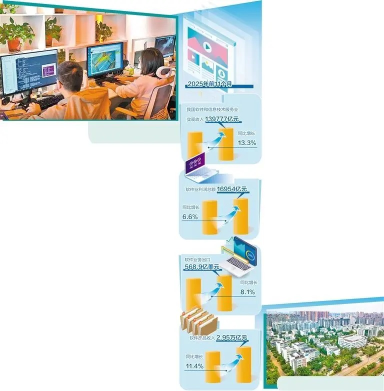 工业和信息化部数据显示,2025年前11个月,我国软件和信息技术服务业(以下简称“软件业”)运行态势良好,实现收入139777亿元,同比增长13.3%;软件业利润总额16954亿元,同比增长6.6%;软件业务出口568.9亿美元,同比增长8.1%,增速连续9个月保持正增长。