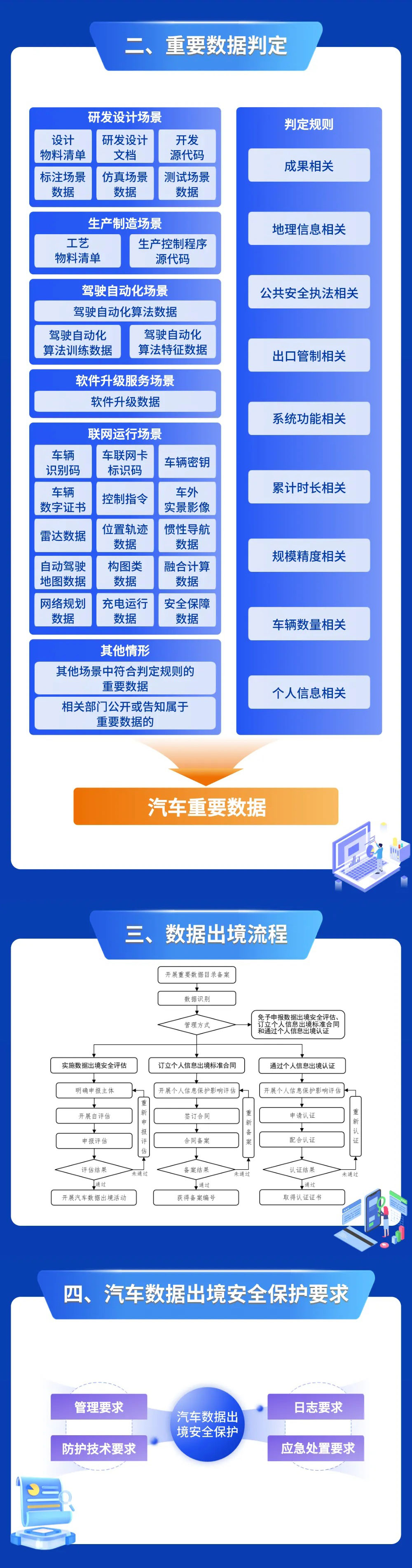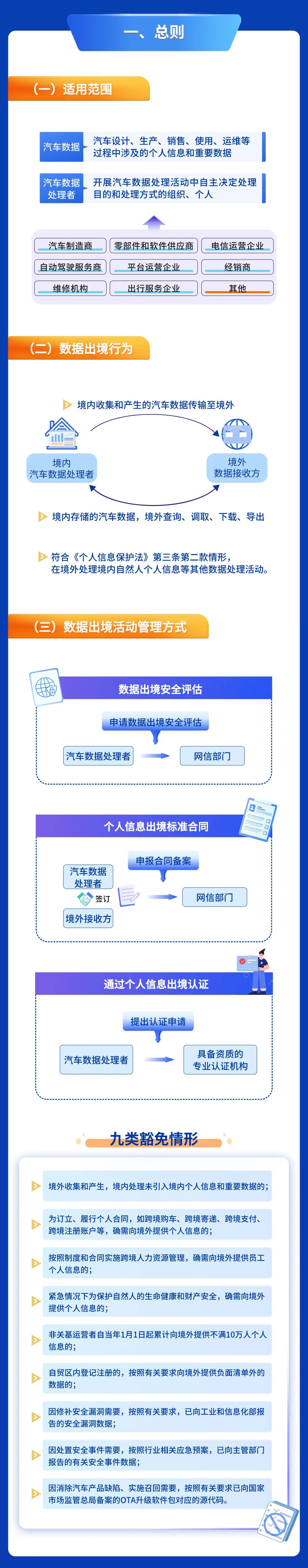 《安全指引》规定了汽车数据出境活动管理方式和适用条件,提出九类豁免情形,面向研发设计、生产制造、驾驶自动化、软件升级、联网运行等业务场景细化重要数据判定规则,明确开展数据出境安全评估、订立个人信息出境标准合同或者通过个人信息出境认证的工作要求,并从管理制度、技术防护、日志管理、应急处置等方面提出保护要求,指导企业规范开展数据出境活动,提升汽车数据安全保护水平。![]()