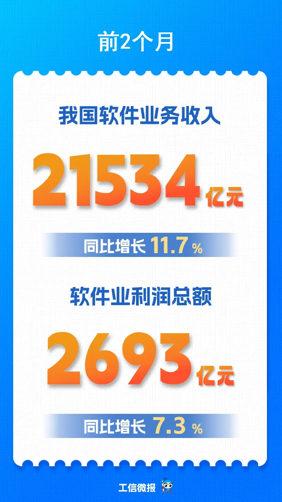 前2个月,我国软件业务收入21534亿元,同比增长11.7%。软件业利润总额2693亿元,同比增长7.3%。软件业务出口103.8亿美元,同比增长12.7%。